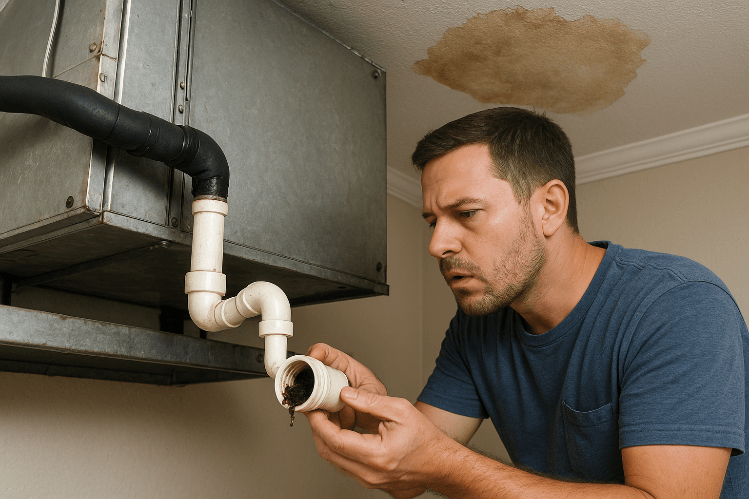 Your air conditioner pulls humidity from indoor air while it runs. Moisture condenses on the evaporator coil. That water drops into a drain pan and flows out through a small PVC line to the exterior or a plumbing tie in. When that pathway gums up with algae or debris, condensate cannot leave. It backs up. The pan fills. Then it overflows onto ceilings, walls, and insulation.